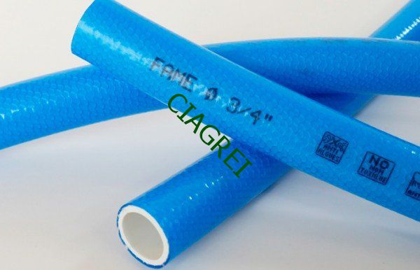 Pvc plastificado, 4 capas. Color turquesa interior, exterior azul transparente brillante. Armadura tricotada. Especial antialgas. Mantiene el riego en punto fijo. El comportamiento de la manguera es ductil al uso.