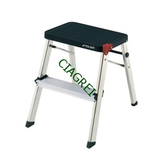 Taburete domestico de aluminio de 1 peldaño más plataforma. Certificado por AENOR según Norma Europea UNE EN-14183. Seguro para evitar el plegado involuntario. Espesor de tubo de 1,2 mm según Norma. Peldaños y rellano antideslizantes.
